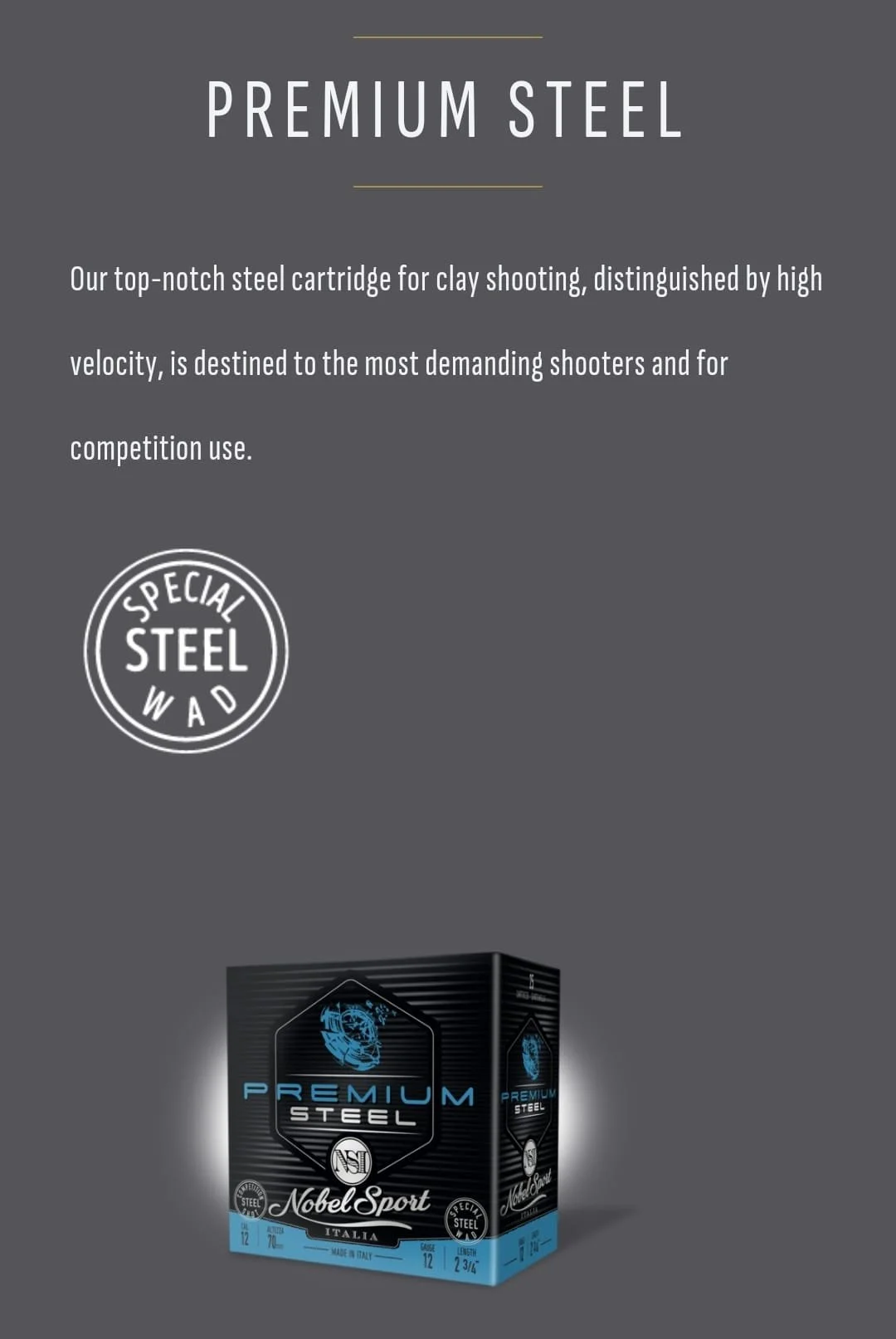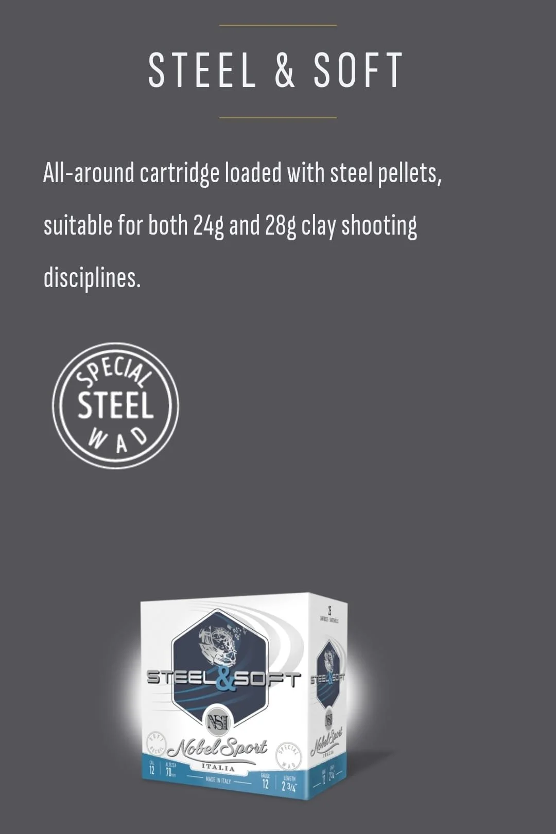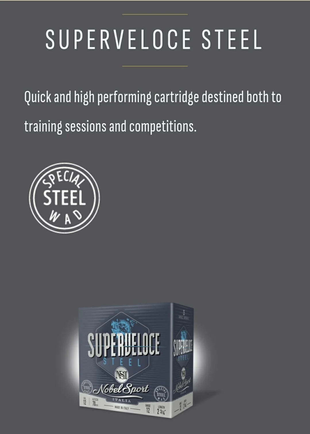 Kwaliteitsmunitie uit Italië gekenmerkt door de “special steel wad”.